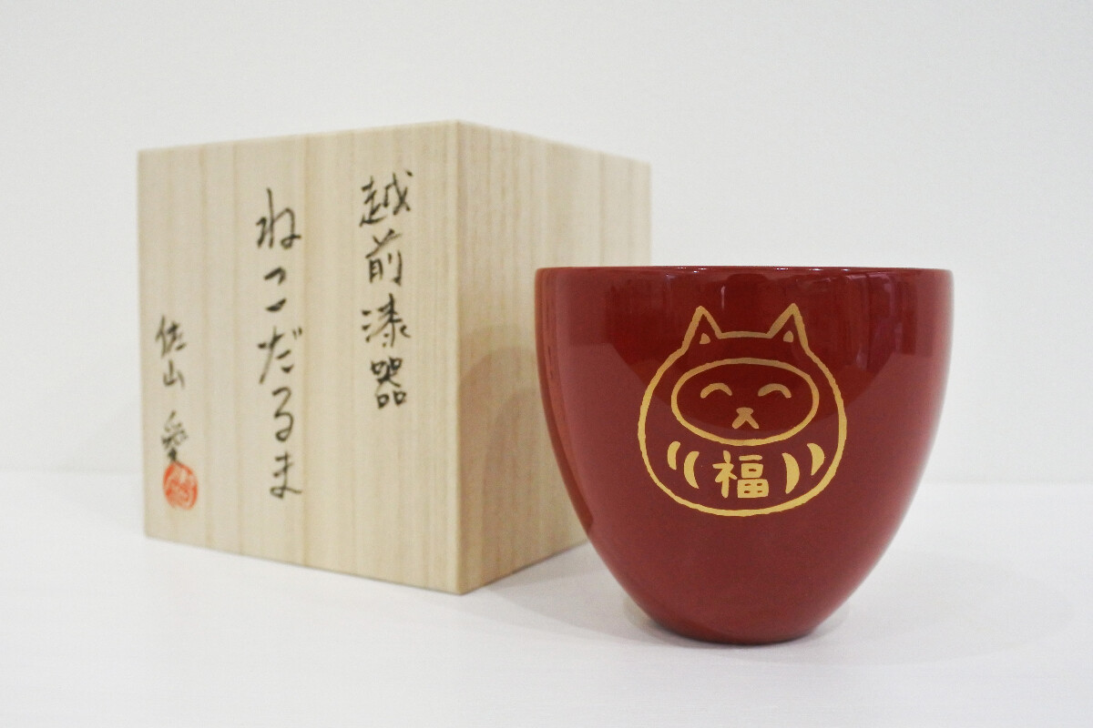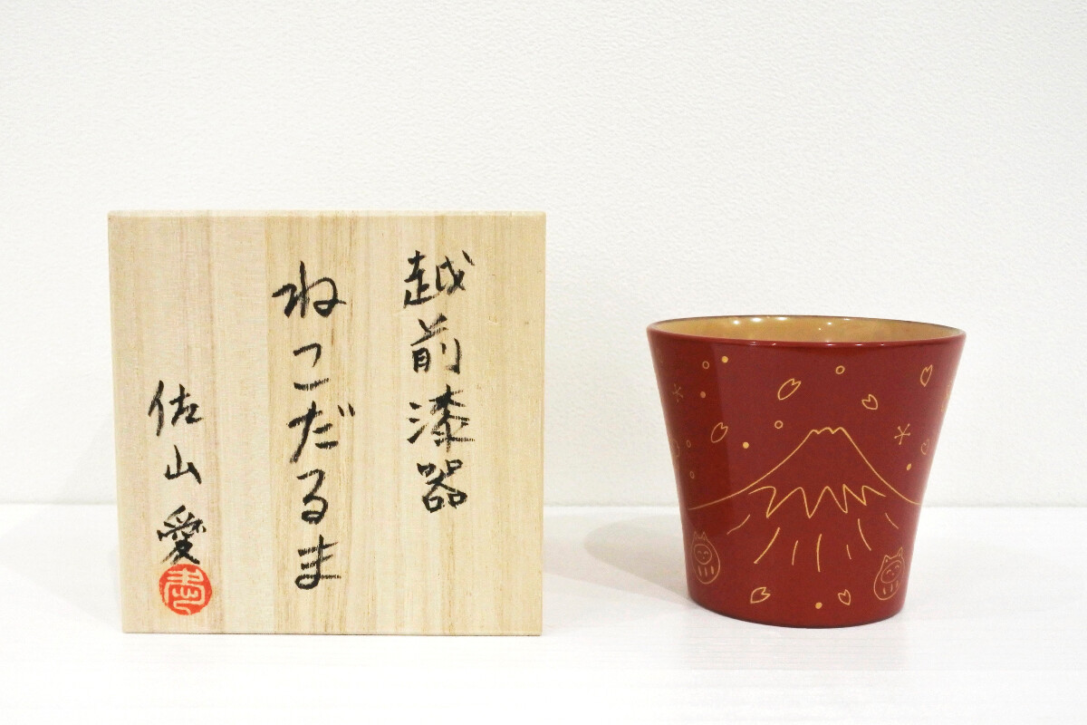 越前漆器カップ 「富士山とねこだるま」 赤 (桐箱付き)