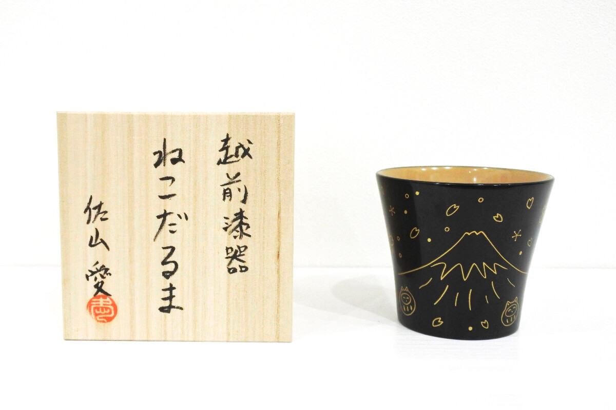 越前漆器カップ「富士山とねこだるま」 黒 (桐箱付き)
