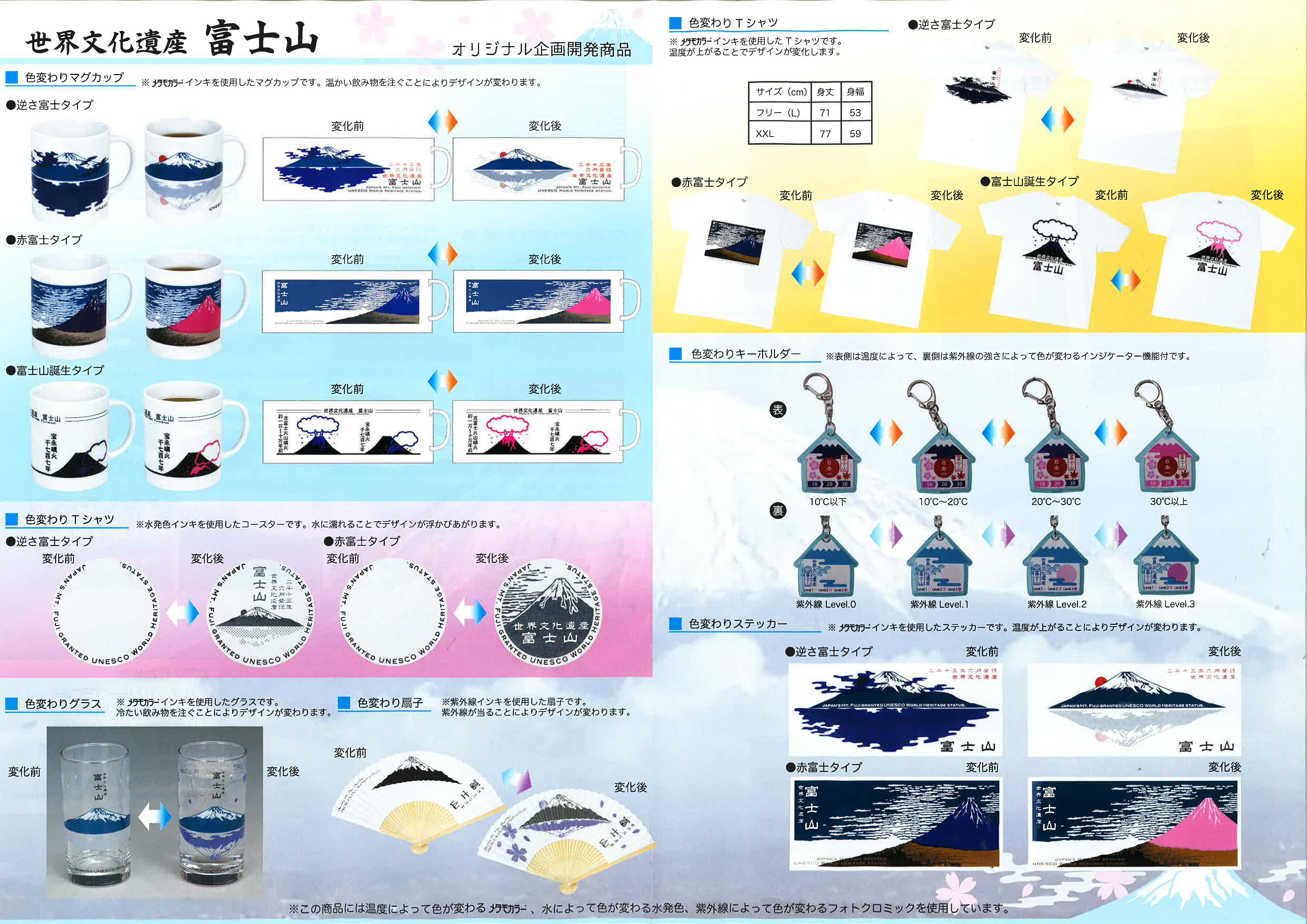 「メタモカラー」を使ったマグカップや湯飲み、水に濡れると絵が現れるコースター、着ると体温で色が変化するTシャツ、日光で絵が現れる扇子、気温や紫外線の強さがわかるキーホルダーなどを出展します。お土産品、キャラクター商品、企業向け販促品として広くご利用頂けます。