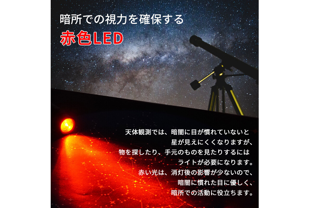 天体観測や昆虫採集、夜釣りなど、暗所での活動に。