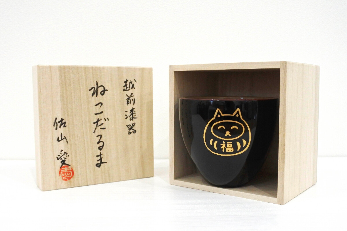 越前漆器カップ「富士山とねこだるま」 黒 (桐箱付き)